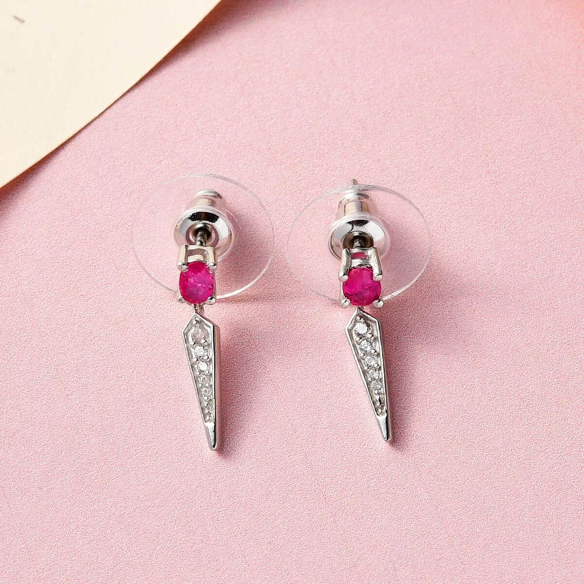 Inspired by the classic geometric pattern, these Montepuez ruby and natural white zircon earrings is the modern interpretation of minimalist designs. Geometric pattern symbolizes structure and order in the passage of life. Ruby is embellished above the white zircons on frame to magnify the brilliance of the earrings. The absolute uniformity of gemstone is ascertained to offer brilliance, cut, clarity, and consistent pattern. Modern cut offers a stylish look as compared to the other traditional cuts with balanced light dispersion from different angles. Ruby exhibits pinkish red color and exceptionally rare. These earrings are gracefully designed in sterling silver with a luminous finish, enhancing the charm of the design. The hypoallergenic metal frame protects the skin from allergies ensuring the longevity of the jewelry. The style of this durable jewelry set makes it an ideal choice of adornment for various occasions.