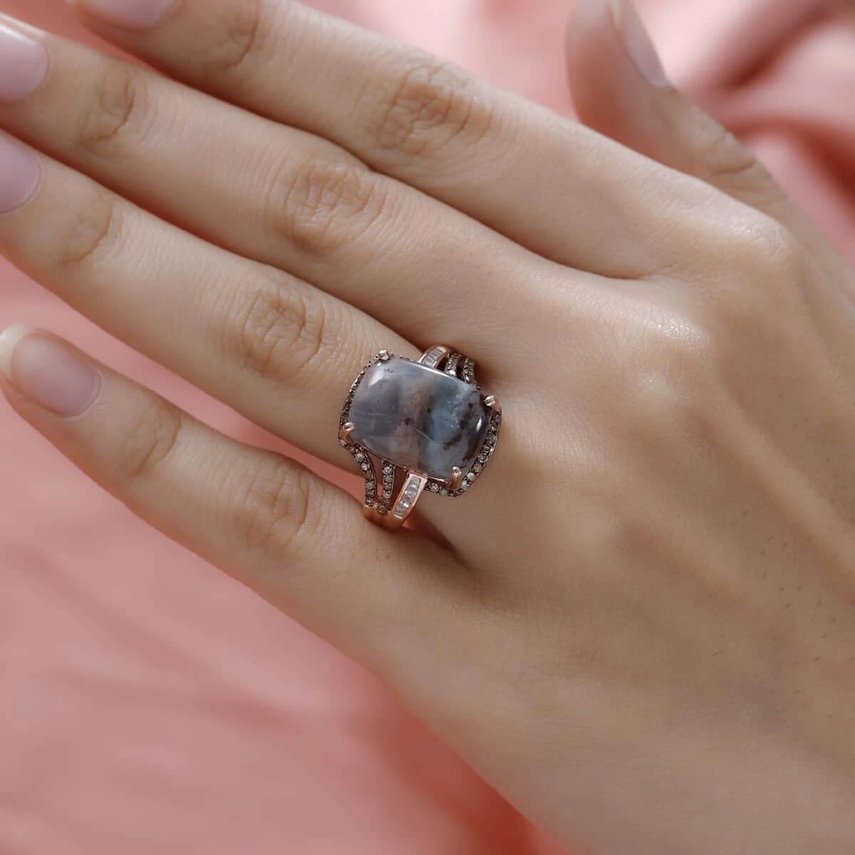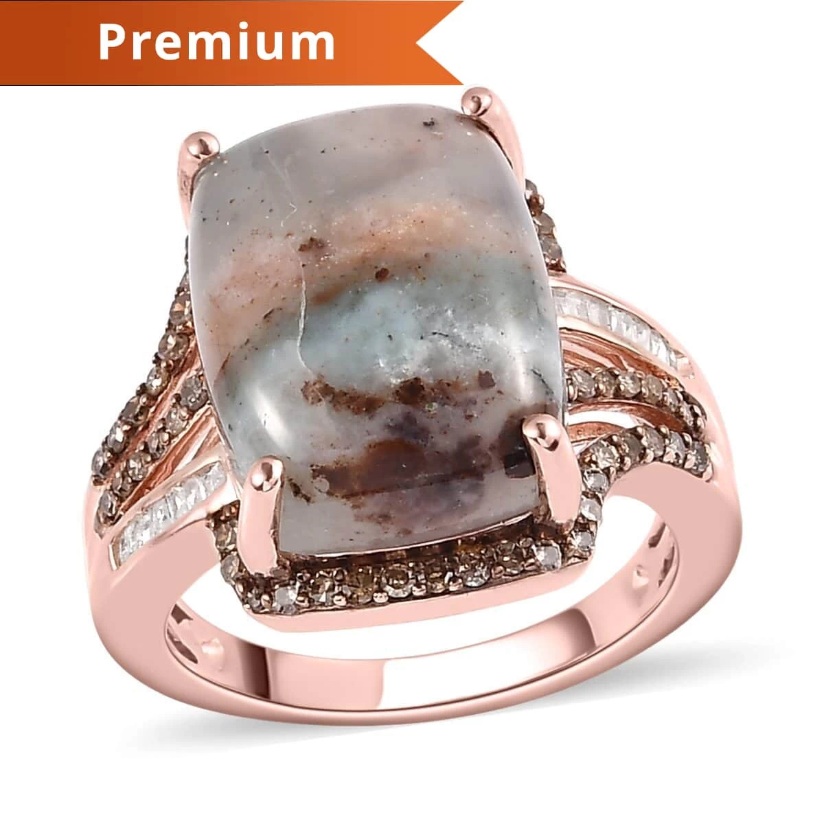 Elegantly crafted, this zimbaparse and diamond ring brings forth the most celebrated designs of the era. The whispering of sea waves is captured in this ring design, symbolizing vastness, depths with an essence of calmness. Zimbaparse is embellished in the center with white and champagne diamonds forming a contemporary halo pattern. The enhanced size of the center gem displays the vivid colors, complementing with the opulence of diamonds. Zimbaprase is a vivid bluish green variety of chalcedony with unique matrix of white and brown. The diamonds are sorted with utmost precision to sustain the uniformity of the design, offering fine cut, clarity, and defined structure. This fashionable ring is intricately designed in sterling silver with a fine finish, adding to the elaborate details and rich texture of the frame. This hypoallergenic frame is exceptionally durable, making it an ideal wear in daily rotation. The remarkable arrangement of glittering diamonds with zimbaparse in center intensifies the feminine poise of the ring.