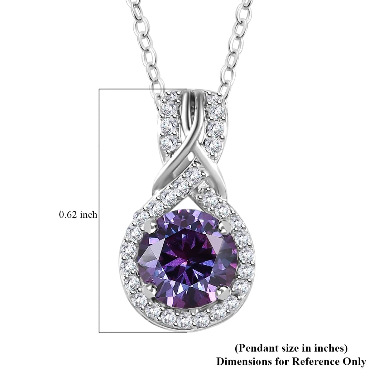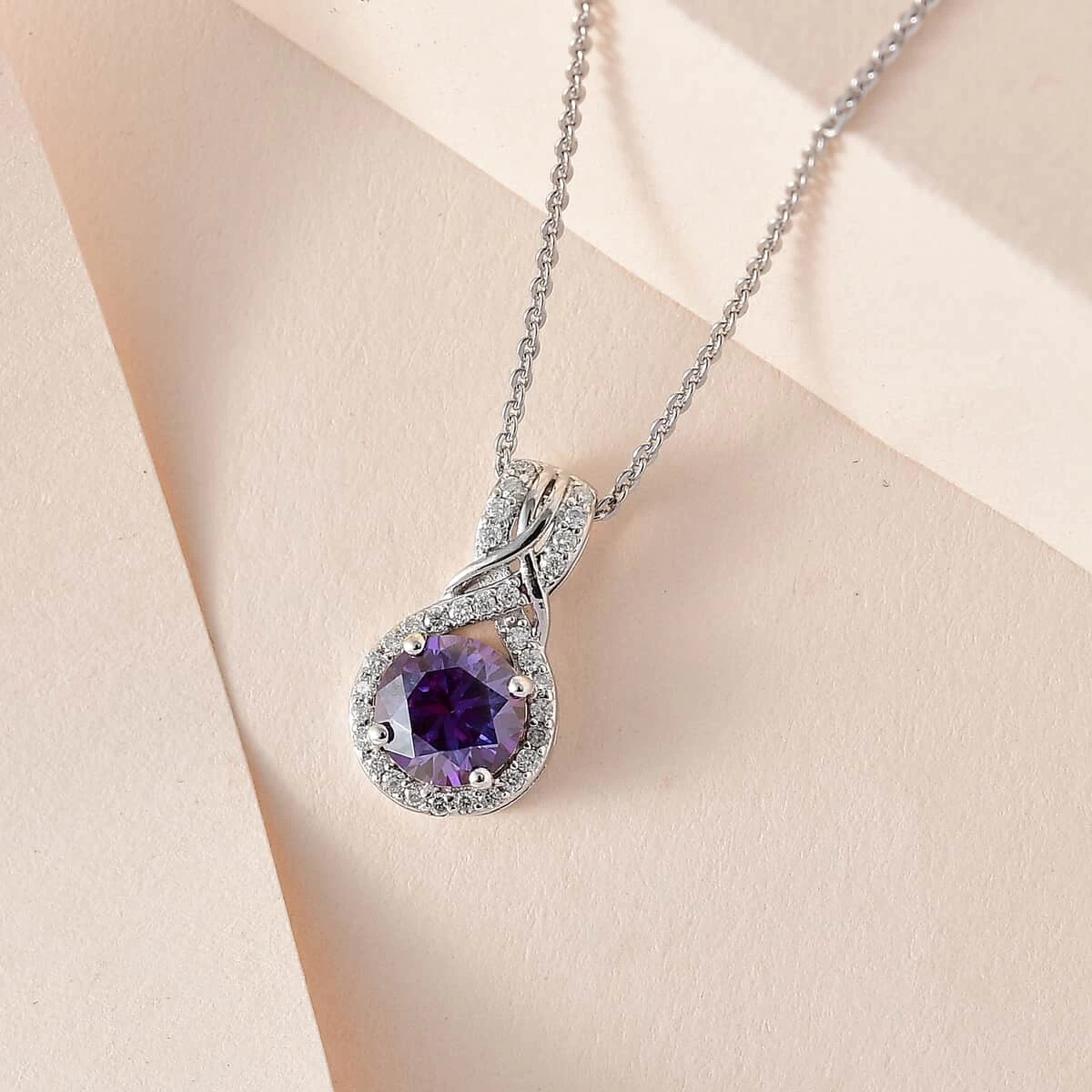 Elevate your style quotient to regal heights with our royal purple moissanite pendant necklace. This exquisite masterpiece is a symphony of luxury and sophistication that will undoubtedly leave a lasting impression. Crafted to perfection, this 20-inch platinum over sterling silver necklace boasts a breathtaking round purple moissanite at its center, encircled by a dazzling halo of pristine white moissanite gems extending gracefully to the bail.