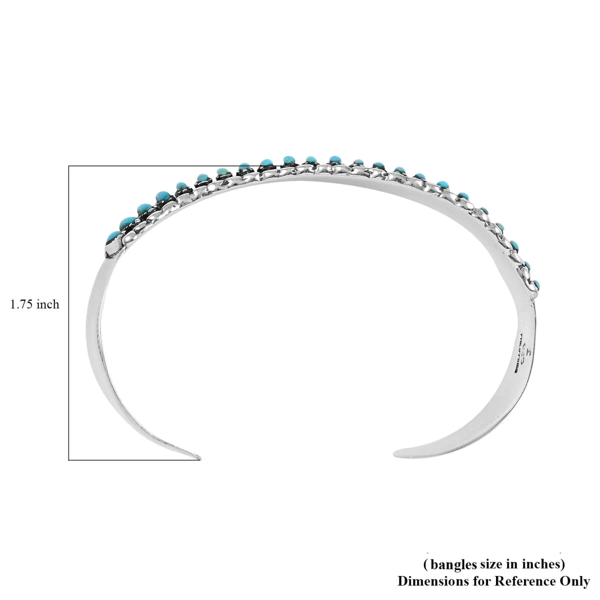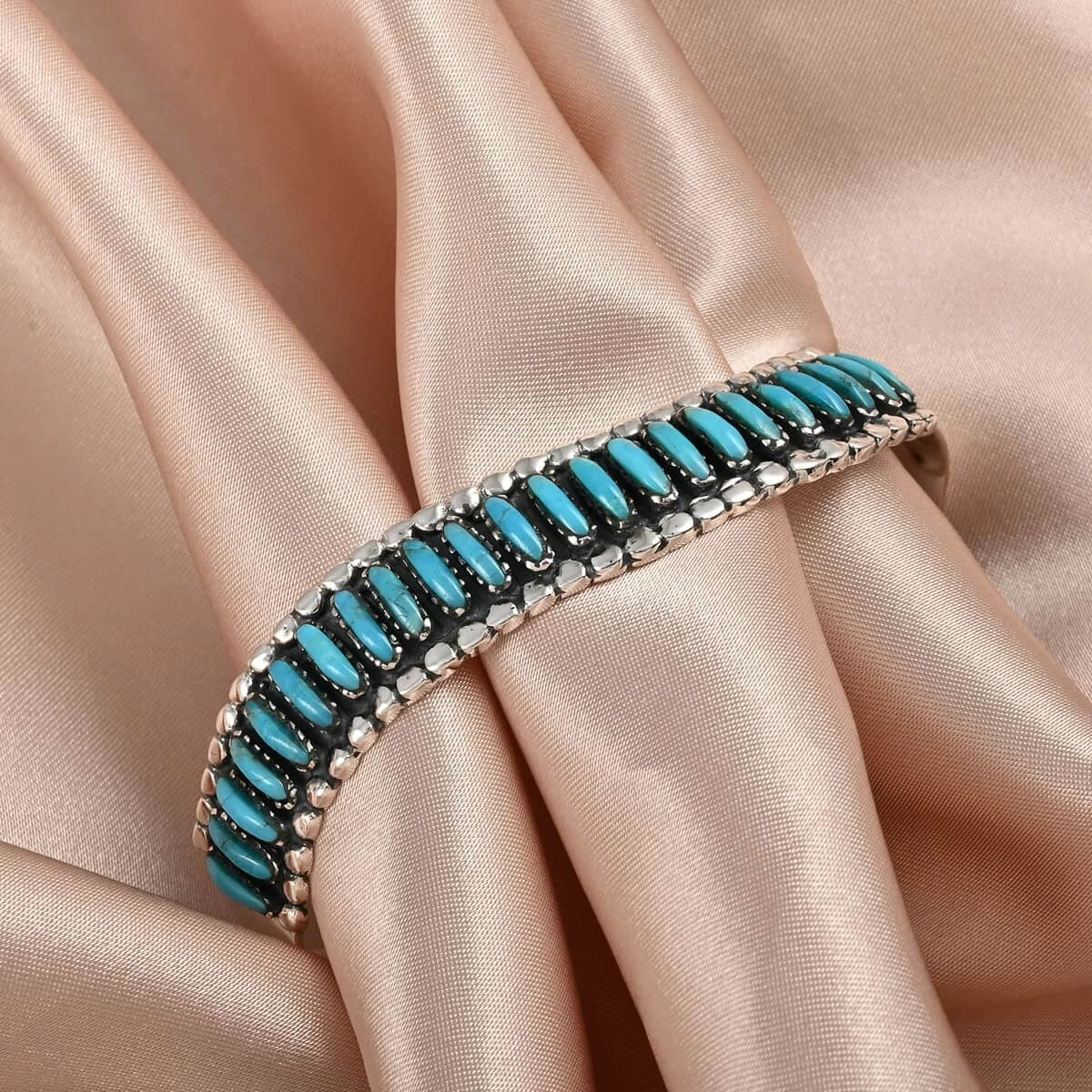 Santa Fe style turquoise cuff bracelet resonates with the floral theme, reflecting simplicity and exuberance of playful hues. The turquoises are finely arranged in a floral pattern, highlighting the smooth texture of the gemstones. This cuff bracelet is carefully crafted in sterling silver, complementing the lush of the gemstone. This Santa Fe style bracelet conveniently slides on your wrist and adds to your bold appearance. It is a minimalist bracelet that would enhance your party look or accessorize your outfits in daily rotation as well. Th literalist art movement signifies a fashion of taste and elegance. The artisans melted, rolled, and cut the beads of silver to give a unique look to the bracelet. Santa Fe style collection offers bold and vibrant jewelry collection from Southwest, remarkably fashioned with staple turquoise.