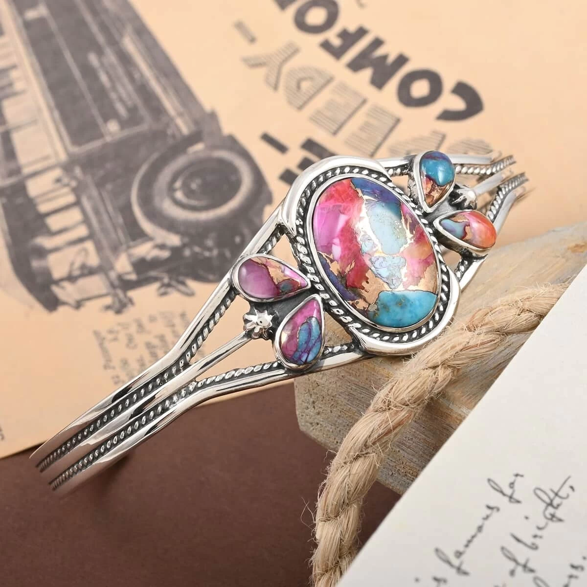Elevate your accessory collection with the Santa Fe Style gemstone cuff bracelet, infusing it with an enchanting and playful charm. This captivating piece encapsulates the vibrant essence of Santa Fe, combining imaginative design elements with impeccable craftsmanship. It transcends the realm of ordinary jewelry, becoming a delightful and wearable expression of artistic flair.