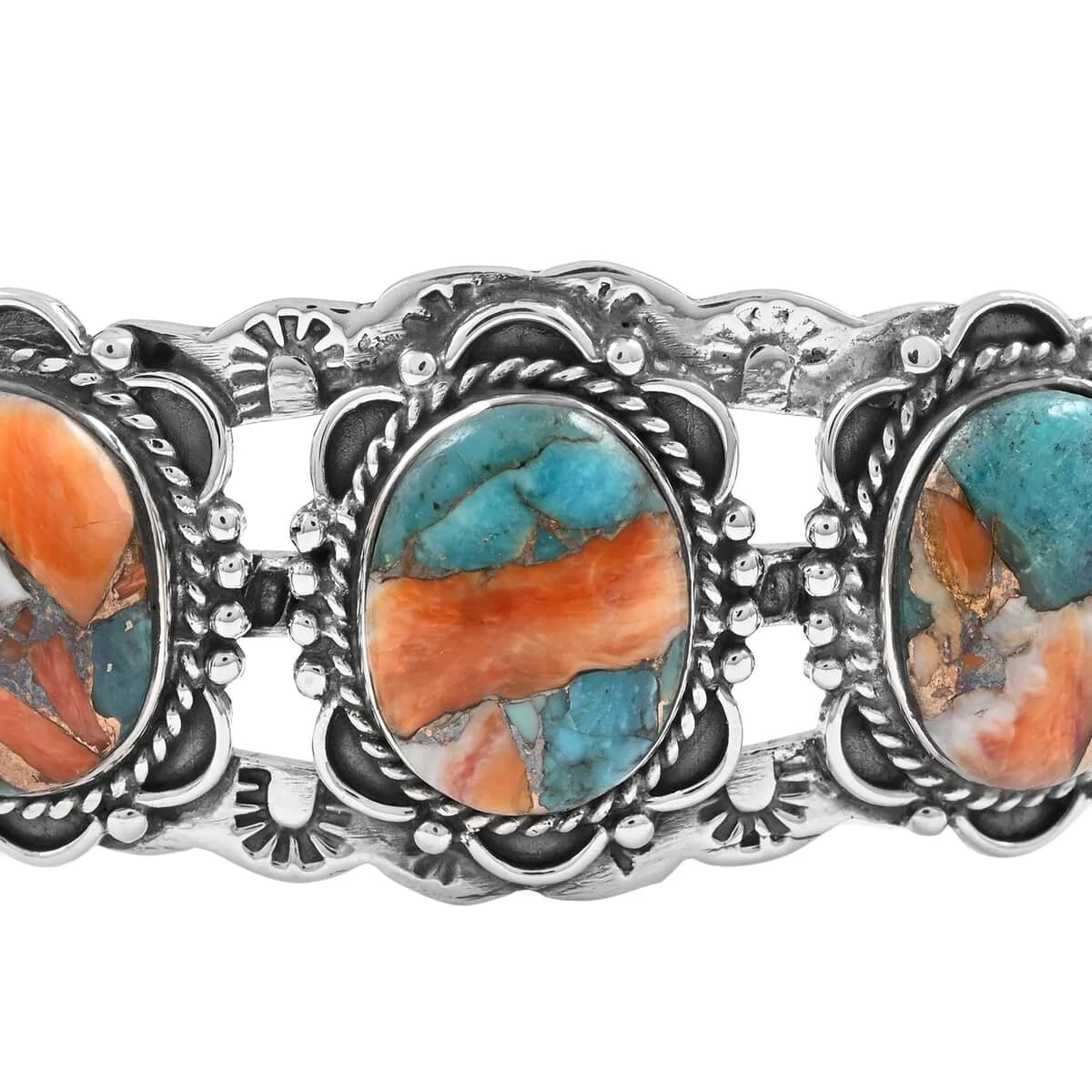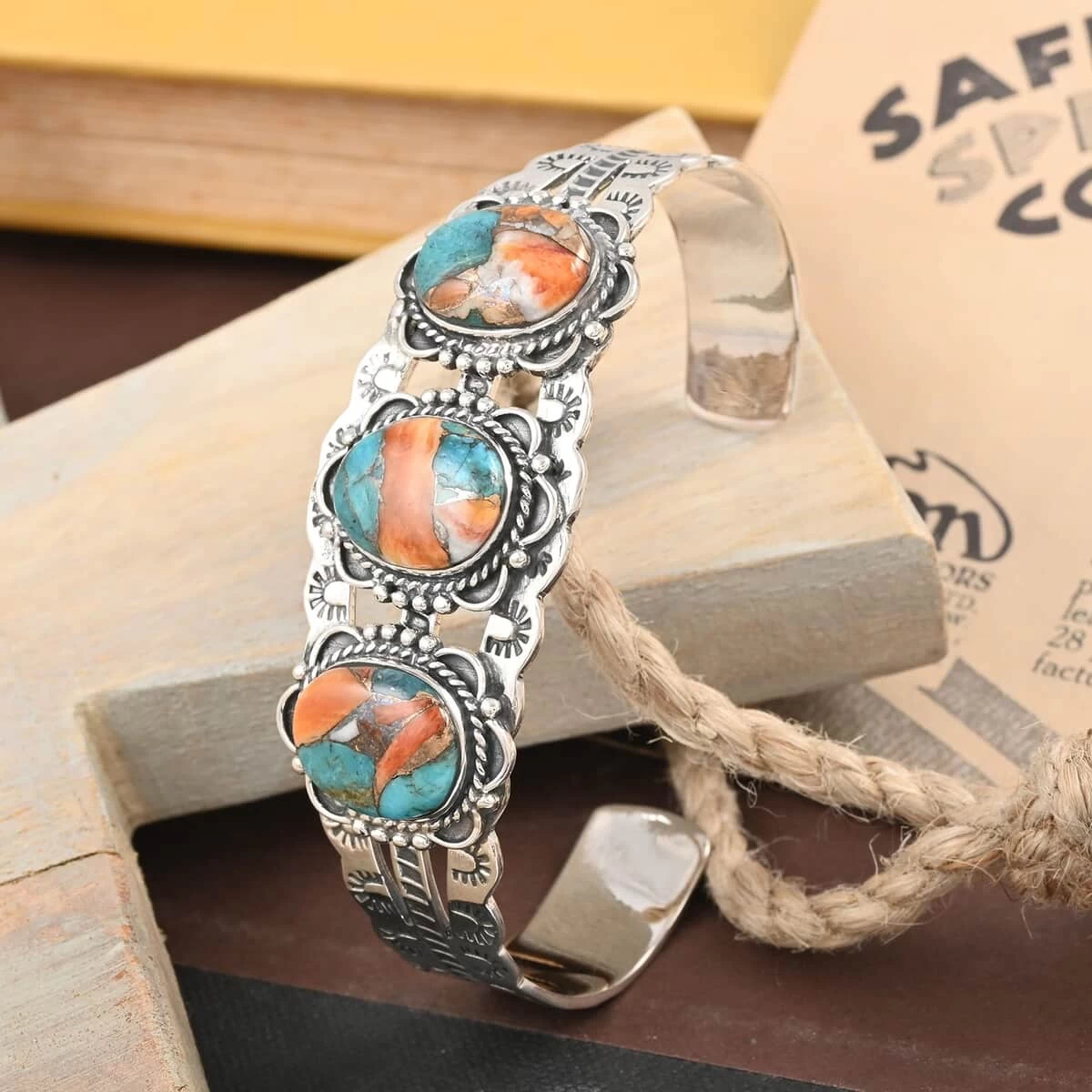 Indulge in a splash of vibrant elegance with this Santa Fe Style gemstone cuff bracelet. Expertly designed to infuse your look with a jovial charm, this exquisite bracelet is a playful nod to the effervescent spirit of Santa Fe. Featuring intricate sterling silver craftsmanship and a dazzling array of gemstones, this cuff will have you carrying the spontaneous energy of a desert sunset wherever you go.