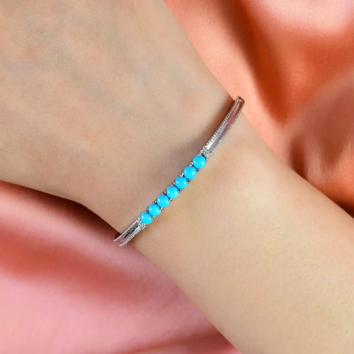 Indulge in the enchanting beauty of this Sleeping Beauty turquoise bangle bracelet. The smooth metal frame adds a touch of modern elegance, making this piece the ultimate statement of effortless sophistication and style.