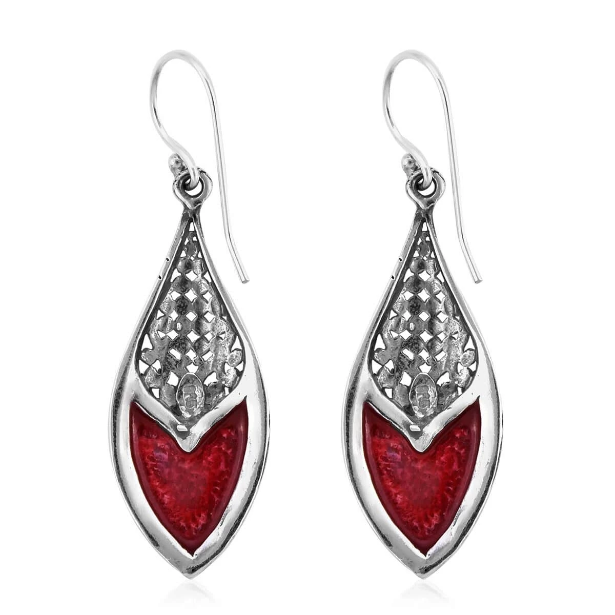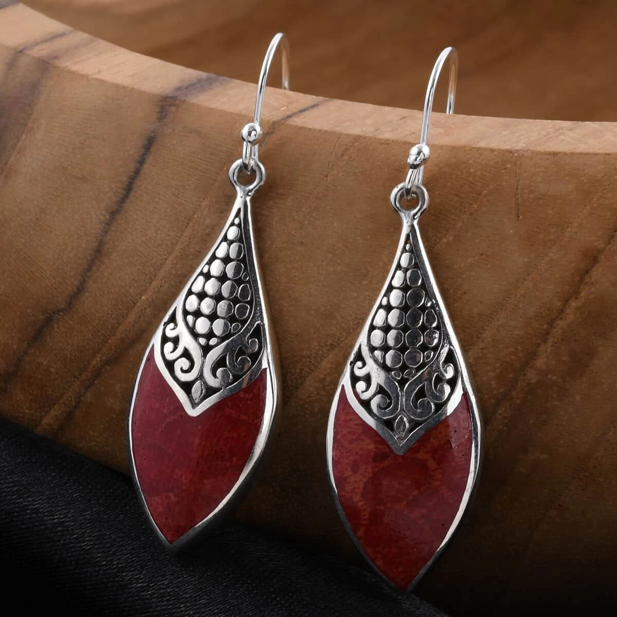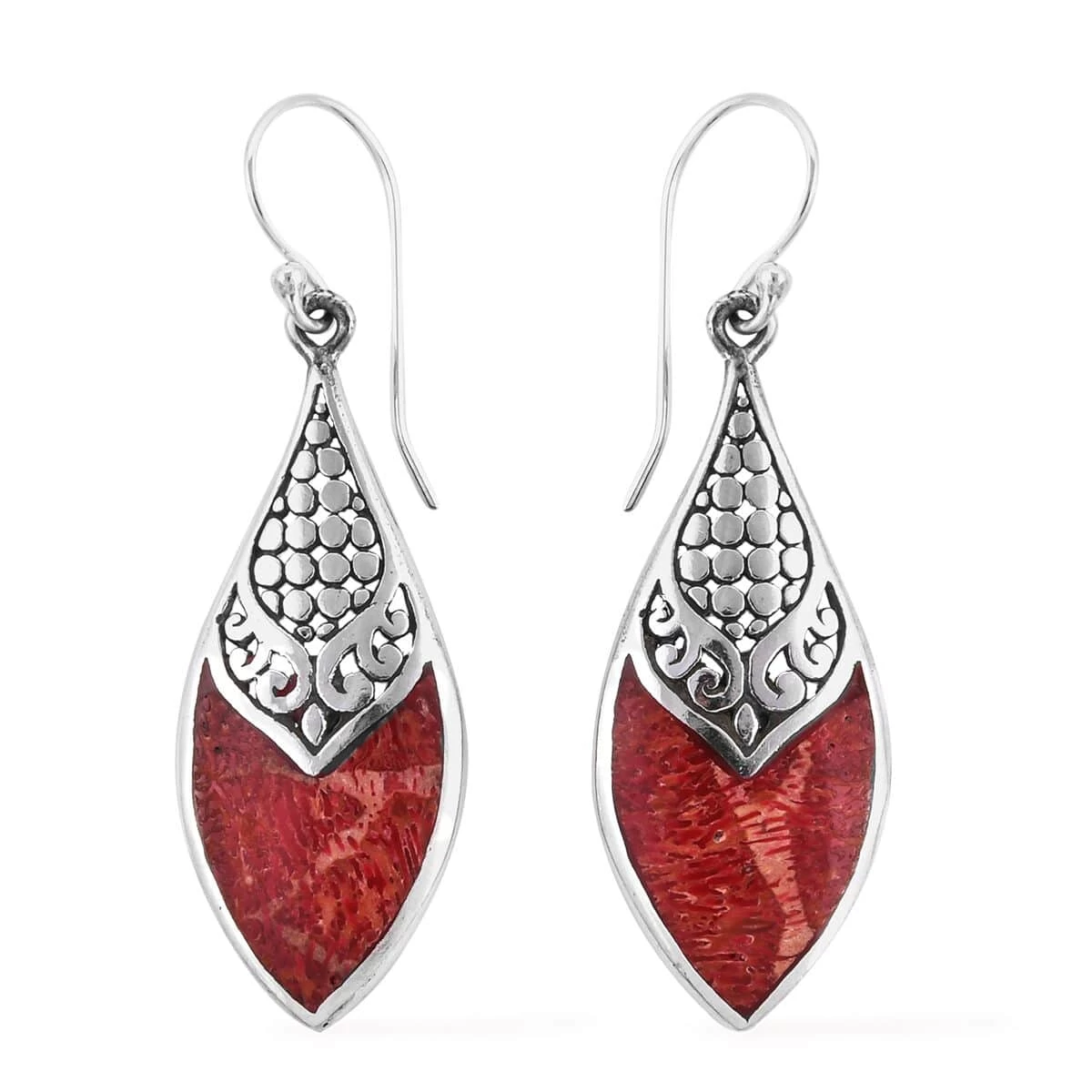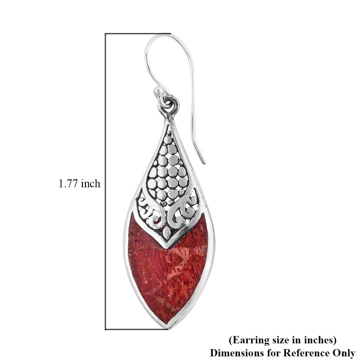 These sponge coral earrings are a pair of elegant and unique jewelry. These sterling silver drop earrings feature a beautiful leaf-shaped metal design embraced with intricate detail and a polished finish. The centerpiece of the earrings is a sponge coral stone, a beautiful natural gemstone that complements the silver perfectly. These red sponge coral earrings are versatile and can be worn for any occasion, whether a formal event or a casual day out.