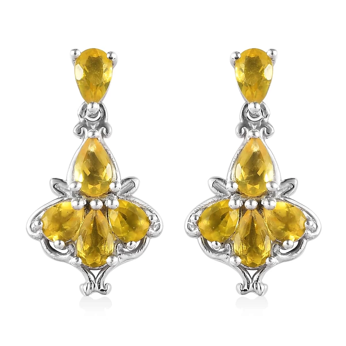 These yellow opal dangle earrings in sterling silver capture the beauty of the modern theme. This theme symbolizes the infusion of newness in an art form. Finely shaped Tanzanian natural canary opals are set vertically. Crafted in sterling silver with a platinum finish, these earrings offer a feminine charm, complementing your personality.
