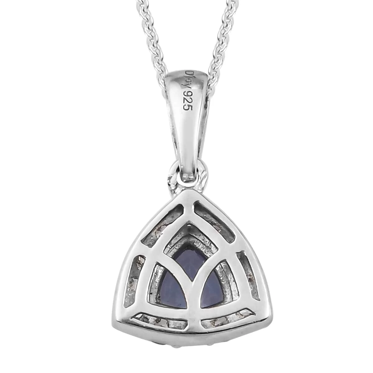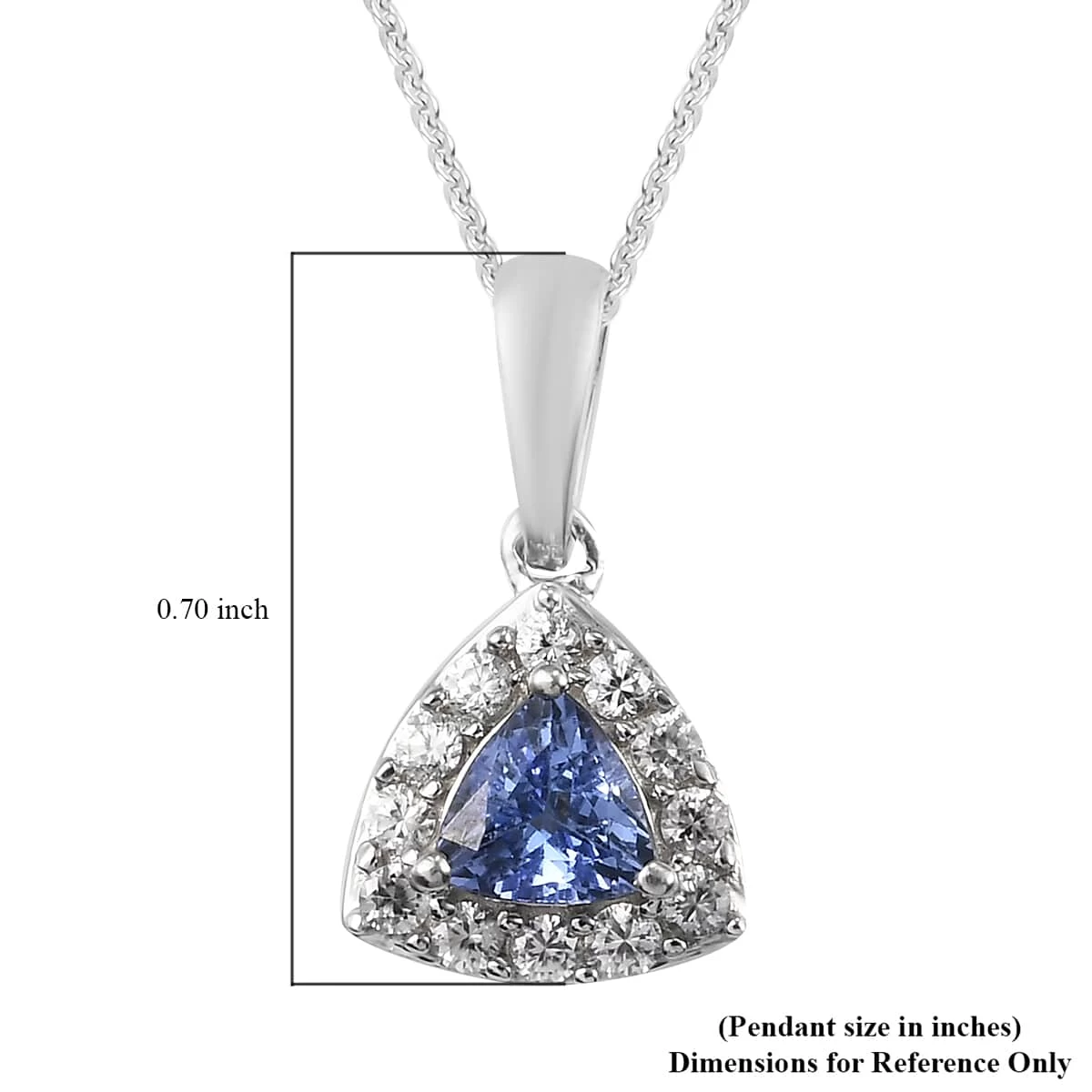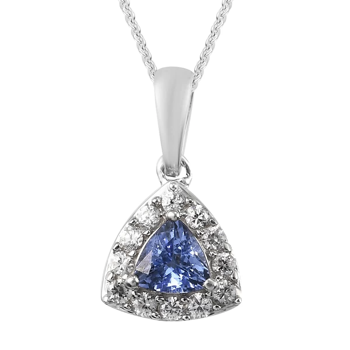 This mesmerizing tanzanite pendant necklace is designed on the halo theme. The symmetrically arranged natural white zircons around the tanzanite complete the halo look. This genuine gemstone pendant is a perfect combo of intensely saturated violetish blue, accompanied by flashes of the deep red of tanzanite and the white brilliance of diamonds. Crafted in platinum over sterling silver, this halo-style pendant is accompanied by 20 inches necklace. Tanzanite is widely appreciated for its pleochroism. The intriguing color shift of the gem won it the honorable title of “stone of transmutation”.