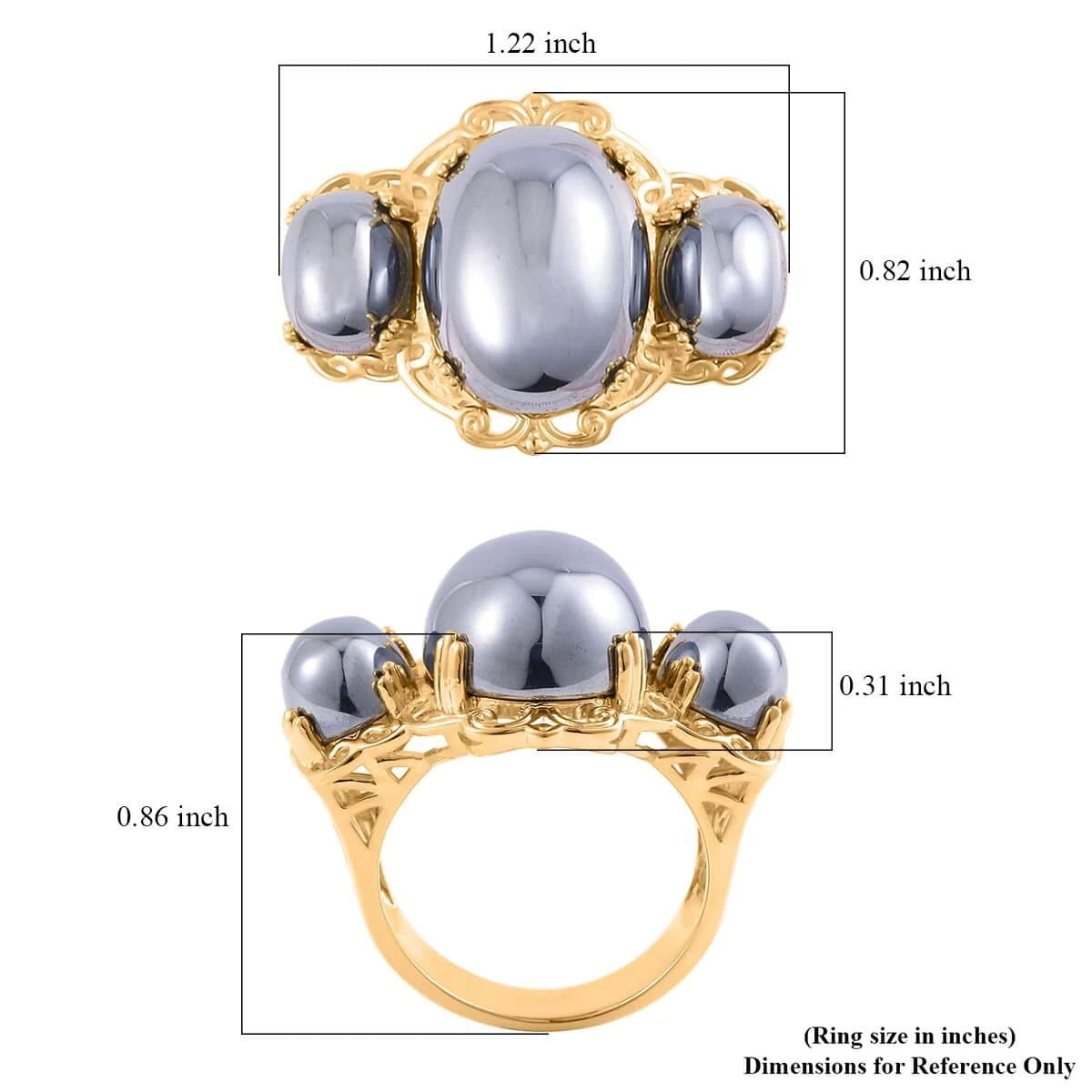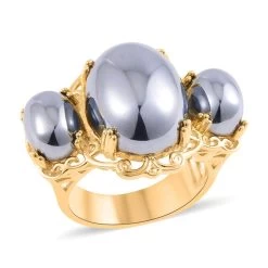 Unlock a universe of elegance and mystique with the Terahertz 3-stone ring. A harmonious alignment of three terahertz stones stands at the centerpiece of this exquisite creation, each a mirror reflecting the ancient wisdom of the earth. Held within a lustrous gold tone setting, the stones are positioned with intent and precision, forming a perfect triad that resonates with harmony and balance.